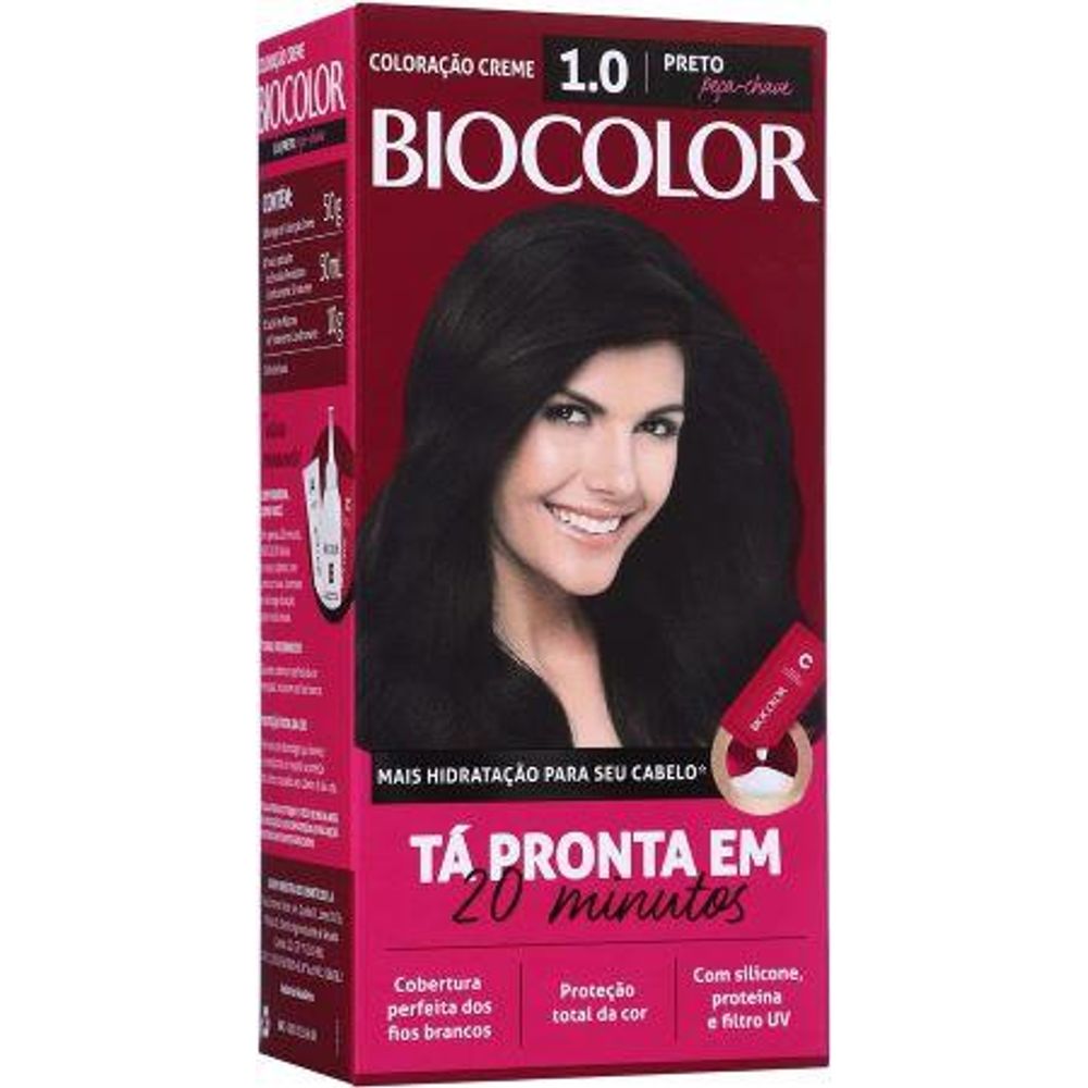 A Tinta de Cabelo Biocolor Mini Kit Preto Peça-Chave 1.0 está de cara nova e com novidades em sua fórmula de condicionador e fragrância. Oferecendo uma cobertura perfeita dos fios brancos, cor intensa e durabilidade, a coloração é de fácil aplicação e age em apenas 20 minutos. Além disso, o kit promove um banho de hidratação no cabelo com o novo condicionador Hidratação Power que protege e entrega maciez aos fios. Sua composição conta com amônia e um novo aroma floral. Mude seu visual com Biocolor!