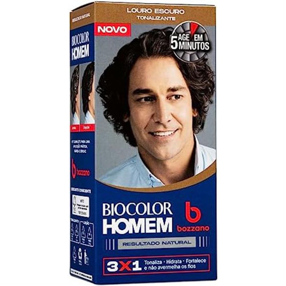 As marcas líderes em coloração masculina e cuidados masculinos se uniram para apresentar o novo Tonalizante de Cabelo Masculino Biocolor Homem Bozzano Louro Escuro. Com ação rápida, em apenas 10 minutos você terá um resultado natural, cabelos ainda mais hidratados, fortalecidos e sem avermelhar os fios. O produto é indicado para aplicação no cabelo e para todos os tipos de cabelo.
